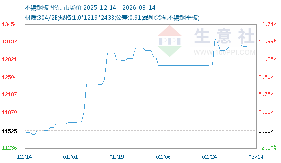 3月13日生意社不锈钢基准价为14433.33元/吨